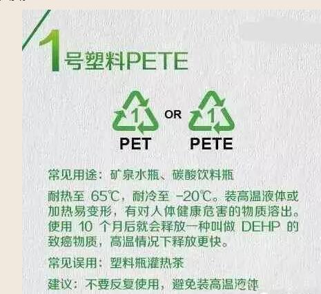 常見礦泉水瓶、碳酸飲料瓶等 。耐熱至70℃易變形, 有對人體有害的物質(zhì)融出。1號塑料品用了10個月后,可能釋放出致癌物DEHP。不能放在汽車內(nèi)曬太陽;不要裝酒、油等物質(zhì)。